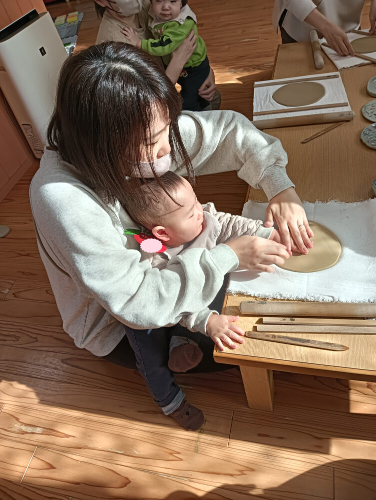 続きを読むぴかりんくらぶに続き、すももくらぶでも酔月焼き体験を行ないました! ママが近くから離れたことに気付くとすぐに泣いてしまう子、しばらく遊んだ後ママパワーをチャージしに行く子、ずーっと遊んでいられる子など月齢によっていろんな姿が見られました。 ママたちの中には粘土をこねてはお子さん、形を作ってはお子さん…と大変だったかと思いますが、今の子どもたちの手形を入れたり絵付けをしたりオリジナルなお皿、プレートが出来ました🌝 焼き上がりは2,3か月後を予定しています。どんな作品ができるのか楽しみですね♪ 酔月焼きの西田さんに来園いただきました! 手形をとります✋ 不思議な感触だけど、がんばります‼ 特等席で作品作りを見守っていました(笑) 次回は12月18日(木)「簡単おかし作り♪」です🍫 チョコペンでイラストを描いたり、簡単なデコレーションをしたおかし作りをしましょう。 お持ち帰りして、育児の合間のティータイムのお供にしてくださいね☕ みなさんのご参加をお待ちしています🤗