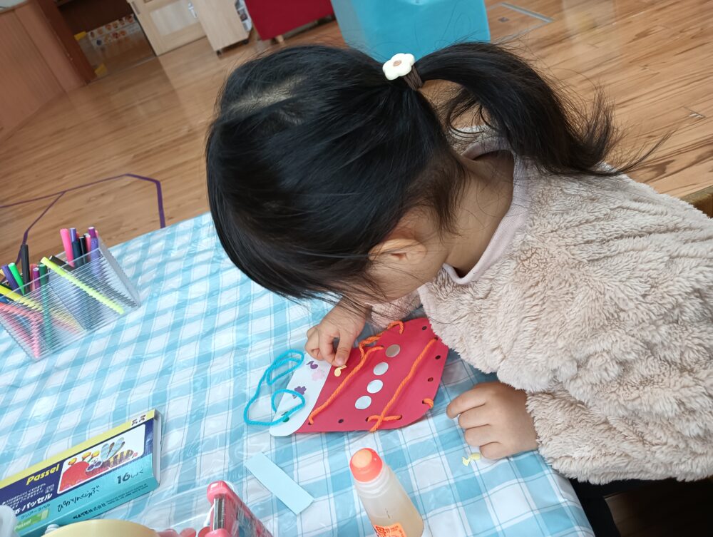 続きを読む今年最後のぴかりんくらぶは、24,25日のクリスマスに向けてお部屋に飾れるブーツともみの木のオーナメントを作りました🎄 妹ちゃんの分ということで、ツリーとブーツの2つを時間目一杯に使って作り上げてくれました💕「おばあちゃんにもみせるんだ♪」とルンルンで教えてくれた姿がとても可愛らしかったです☺ 次回のぴかりんくらぶは、1月27日(火)「雪遊び」です⛄ めごきっずガーデンでダイナミックに雪遊びをしましょう! スキーウエア、手袋、帽子、長靴をお忘れなくお持ちくださいね。 吹雪や雪がぐちゃぐちゃ等難しい時は、ボールプールや新聞紙プール・巧技台で体を動かして遊びましょう🥎