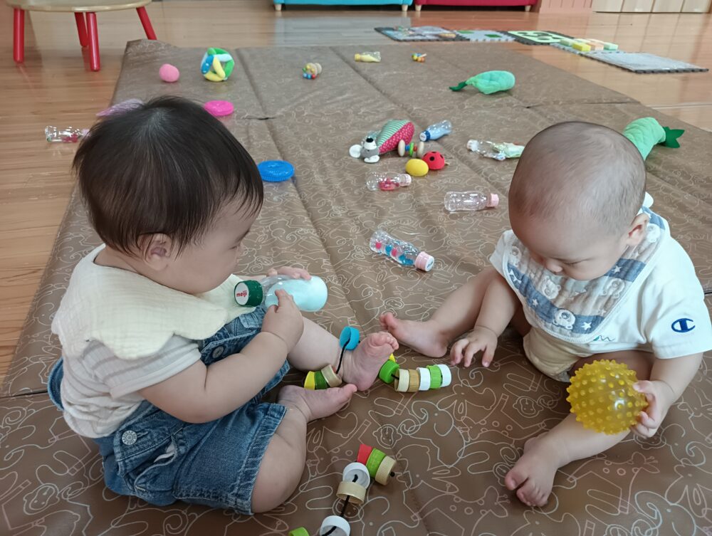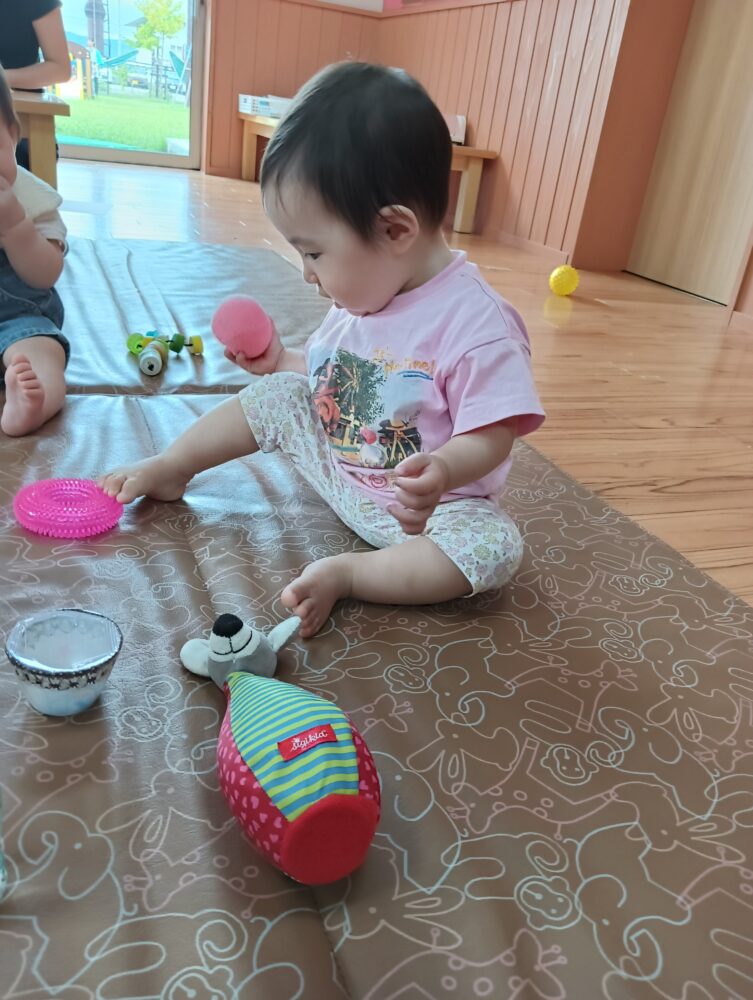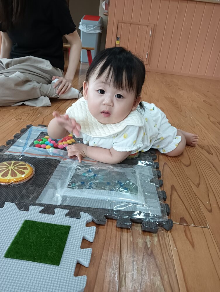 めごきっずガーデン(駐車場側の園庭)の芝生にシートを敷いてゆったりしたり、歩けるようになったお友だちは探索活動を楽しみましょう♪