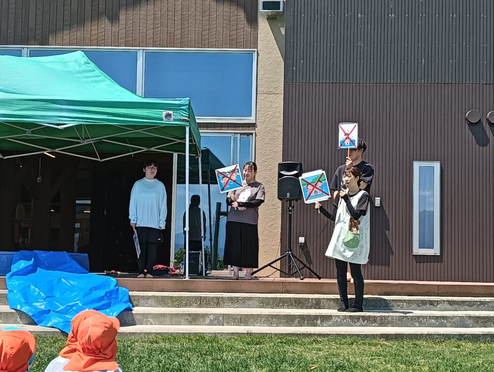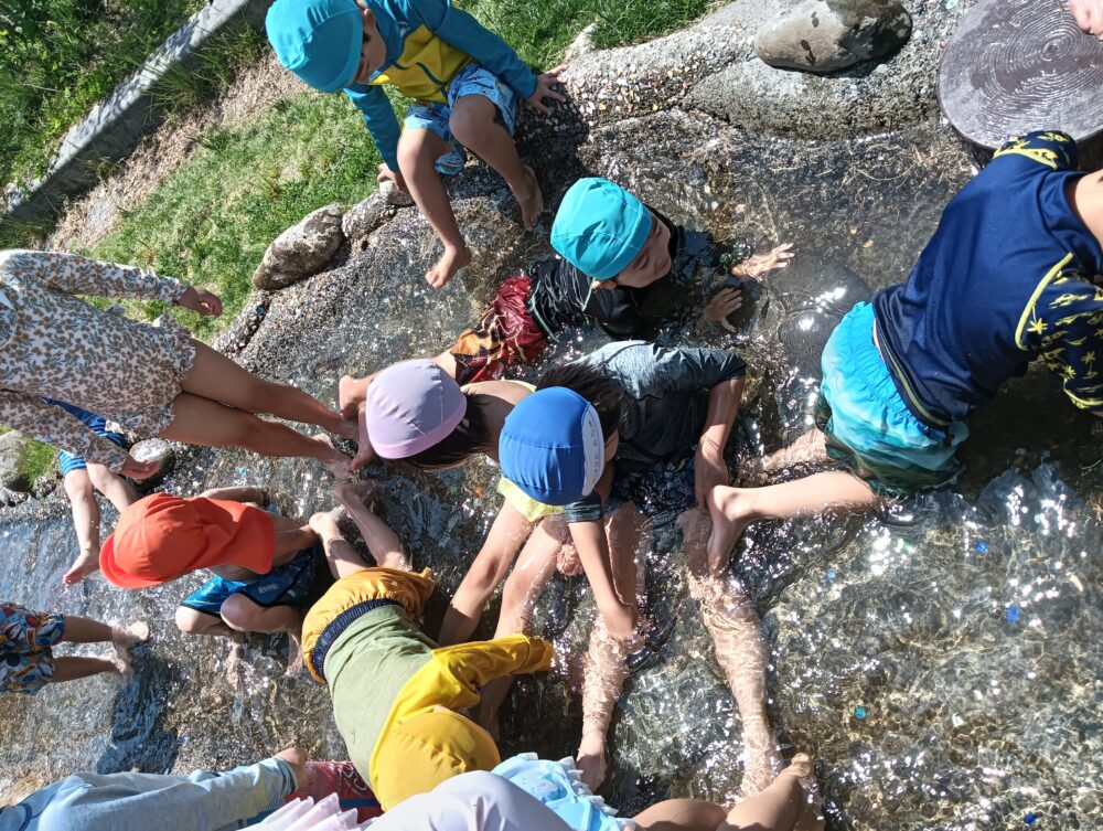 最高の天気の中、子どもたちと安全で楽しく遊べるように、川での遊び方のお約束をし、みんなで準備体操をして楽しく水遊び開きを行うことができました!